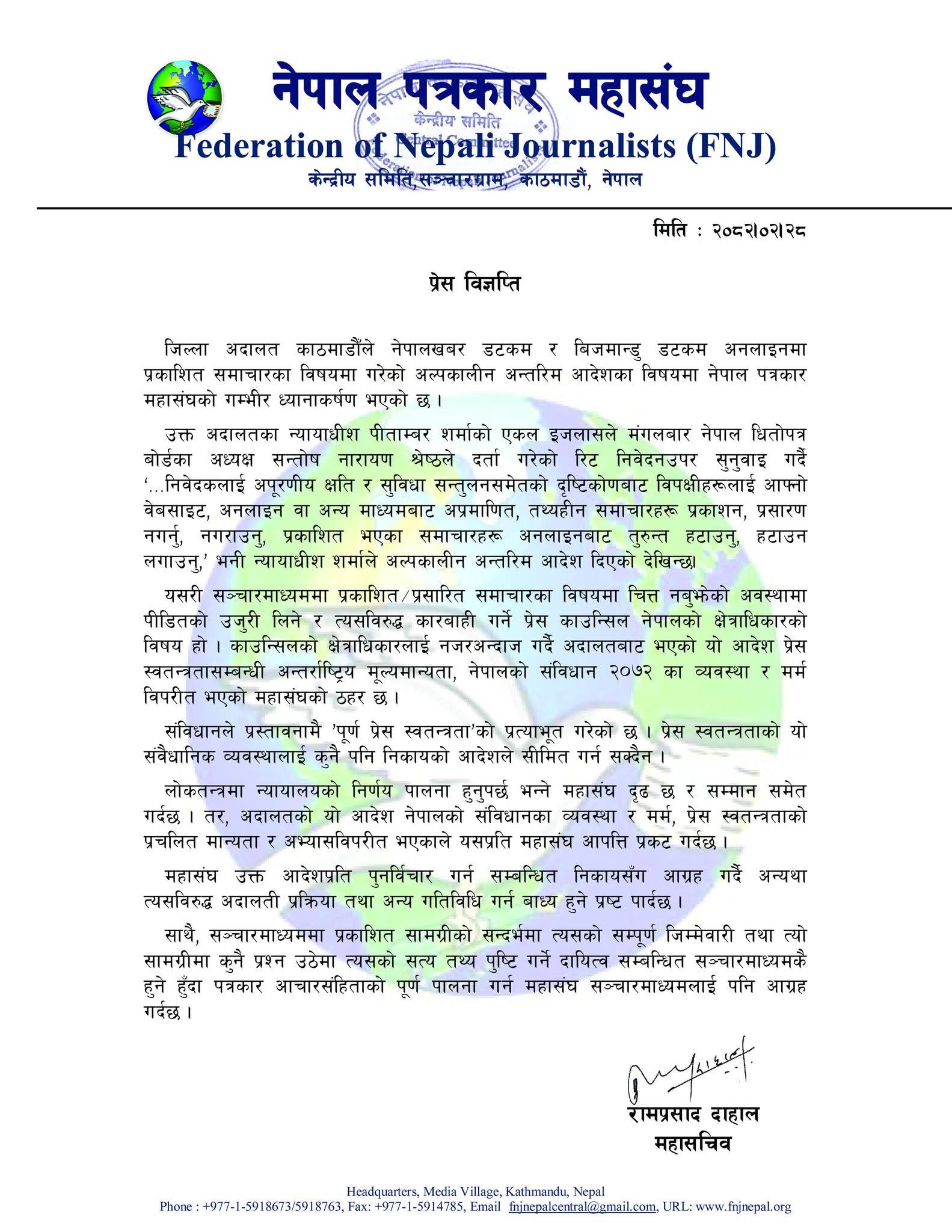 विज्ञप्तिमा थप भनिएको छ, “प्रेस स्वतन्त्रता नेपालको संविधानले प्रत्याभूत गरेको अधिकार हो, जुन कुनै निकायको आदेशद्वारा सीमित गर्न मिल्दैन।”