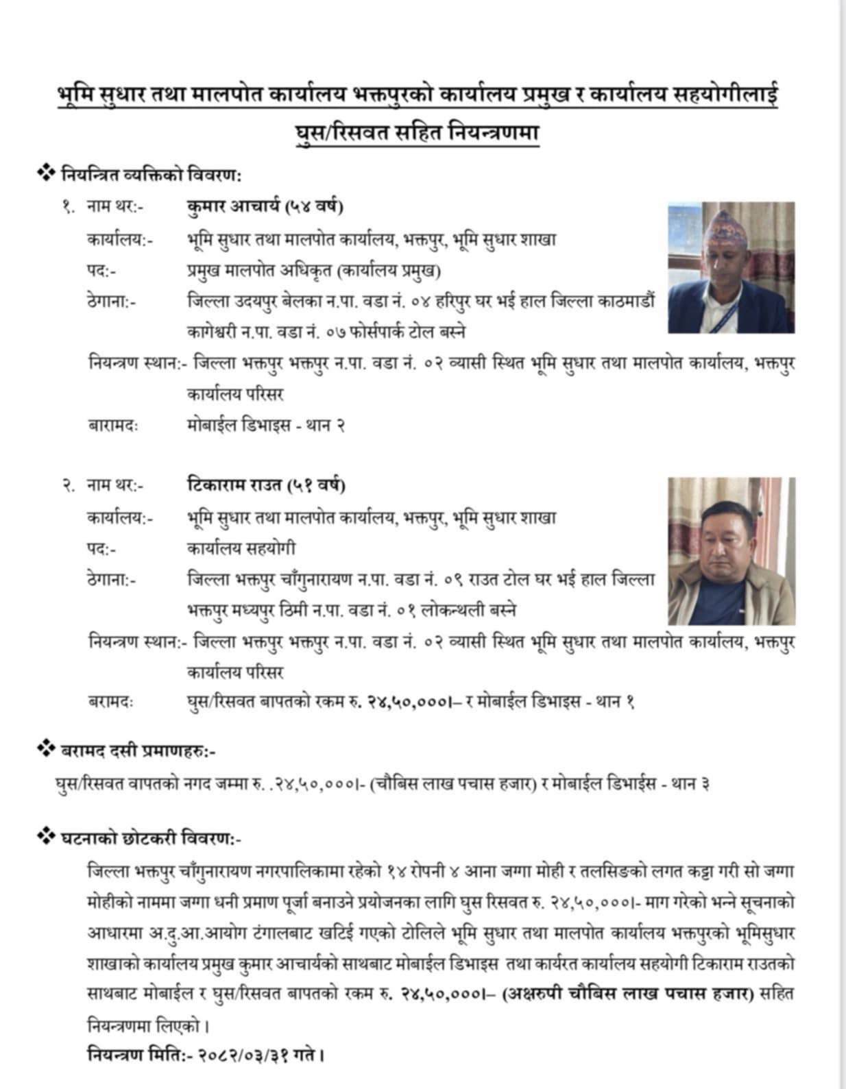 उनीहरूलाई रु. २४ लाख ५० हजार घुस रकमसहित नियन्त्रणमा लिइएको अख्तियारले जनाएको छ ।