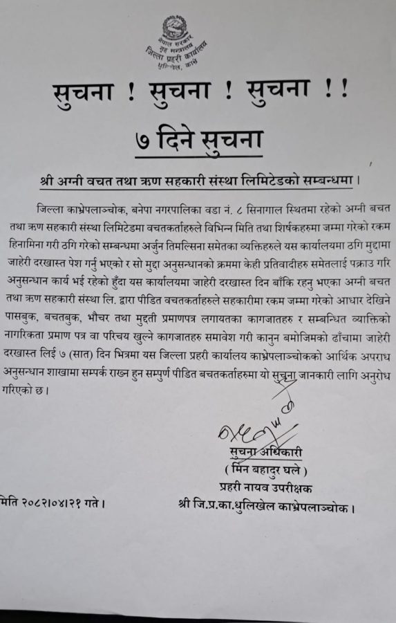 काभ्रेपलाञ्चोक । काभ्रेपलाञ्चोकको बनेपा नगरपालिका–८ सिनागालमा अवस्थित ‘अग्नी बचत तथा ऋण सहकारी संस्था लिमिटेड’सँग सम्बन्धित मुद्दामा जिल्ला प्रहरी कार्यालय धुलिखेलले ७ दिने सार्वजनिक सूचना जारी गरेको छ।