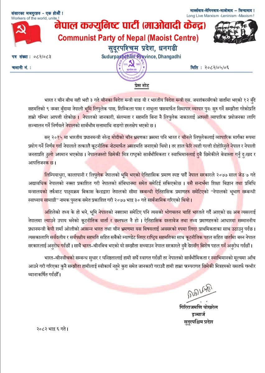 धनगढी । भारत र चीनबीच हालै भएको सम्झौतामा लिपुलेकलाई व्यापारिक मार्गका रूपमा प्रयोग गर्ने सहमति हुनु नेपालको सार्वभौमिकता र राष्ट्रिय स्वाधीनतामाथि ठाडो हस्तक्षेप भएको नेपाल कम्युनिस्ट पार्टी (माओवादी केन्द्र) सुदूरपश्चिम प्रदेशले जनाएको छ।