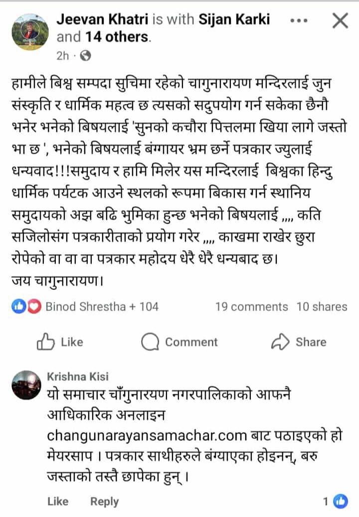 “समुदाय र हामी मिलेर यस मन्दिरलाई बिश्वका हिन्दु धार्मिक पर्यटक आउने स्थलको रूपमा बिकास गर्न स्थानीय समुदायको अझ बढी भूमिका हुन्छ भनेको बिषयलाई ,,,, कति सजिलोसंग पत्रकारिताको प्रयोग गरेर ,,,, काखमा राखेर छुरा रोपेको वा वा वा पत्रकार महोदय धेरै धेरै धन्यबाद छ।” उनले भनेका छन् ।