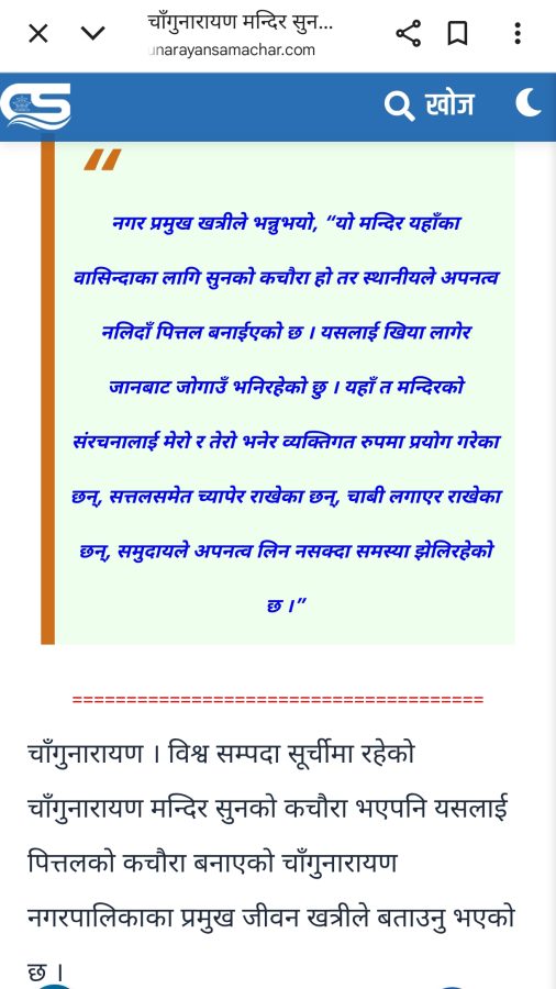 भक्तपुर । “चाँगुनारायण मन्दिर सुनको कचौरा हो, तर स्थानीयले पित्तल बनाए” भन्ने शिर्षकमा चाँगुनारायण नगरपालिकाको आधिकारिक इमेलबाट आएको समाचारको विषयलाई लिएर मेयर जीवन खत्री पत्रकार माथि खनिएका छन् ।