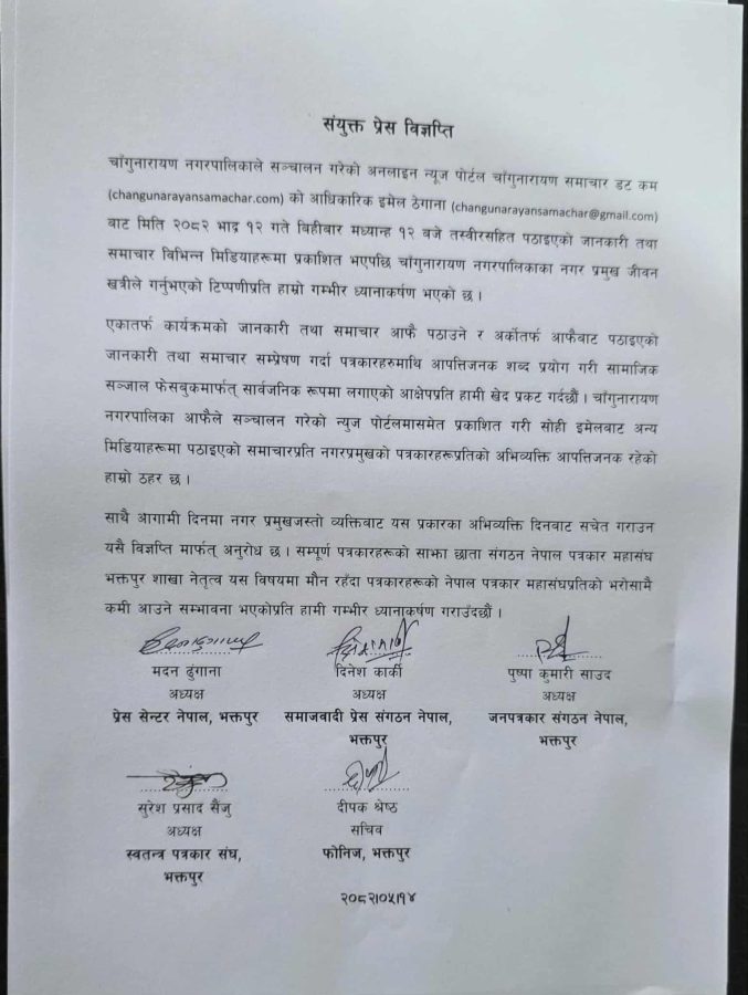 भक्तपुर । चाँगुनारायण नगरपालिकाका नगर प्रमुख जीवन खत्रीले पत्रकारप्रति सार्वजनिक गरेको अभिव्यक्तिप्रति भक्तपुरमा क्रियाशील पाँच पत्रकार संगठनहरूले संयुक्त विज्ञप्ति जारी गर्दै गम्भीर आपत्ति जनाएका छन्।