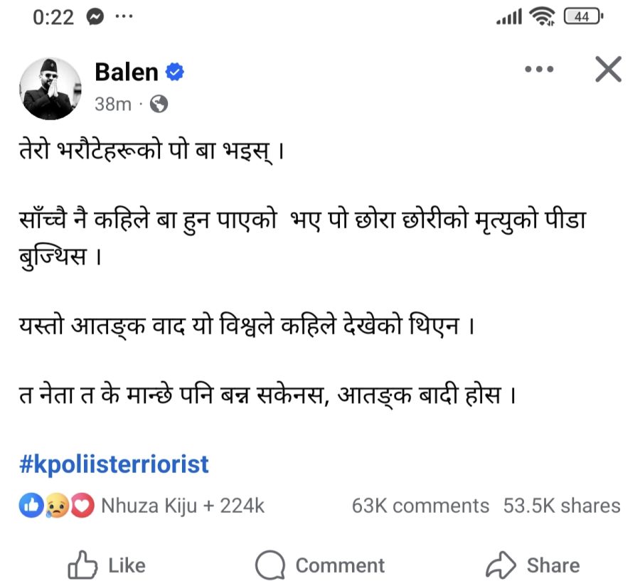 काठमाडौँ । काठमाडौँ महानगर प्रमुख बालेन साहले प्रधानमन्त्री केपी शर्मा ओलीलाई लक्षित गर्दै सामाजिक सञ्जालमार्फत कडा टिप्पणी गरेका छन् ।
