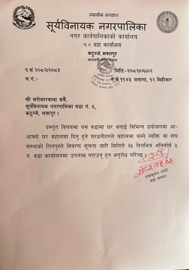 भक्तपुर । सूर्यविनायक नगरपालिका वडा नम्बर ५ को कार्यालयले घर बहालमा दिने घरधनीलाई आफ्नो बहालमा बस्ने व्यक्तिको विवरण बुझाउन अनुरोध गरेको छ।