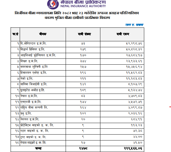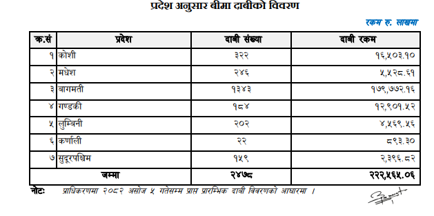 यता, बागमती प्रदेशमा मात्रै १७ अर्ब ९७ करोड रुपैयाँ बराबरको दाबी परेको छ । कोशीमा १ अर्ब ६५ किरोड, मधेशमा ५५ करोड २८ लाख, गण्डकीमा १ अर्ब २९ करोड, लुम्बिनीमा ४५ करोड ६९ लाख, कर्णालीमा ८ करोड ९३ लाख र सुदूरप्रश्चिममा २३ करोड ९६ लाख रुपैयाँ बराबरको बिमा दाबी परेको छ ।