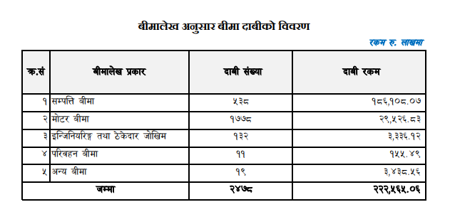 प्राधिकरणका अनुसार ५३८ वटा सम्पति बिमाको दाबी परेको छ । मोटर बिमामा १ हजार ७७८ दाबी, इन्जिनियरिङ तथा ठेकेदार जोखिम बिमामा १३२ दाबी परेका छन् । कुल २ हजार ४७८ दाबी परेका छन् ।