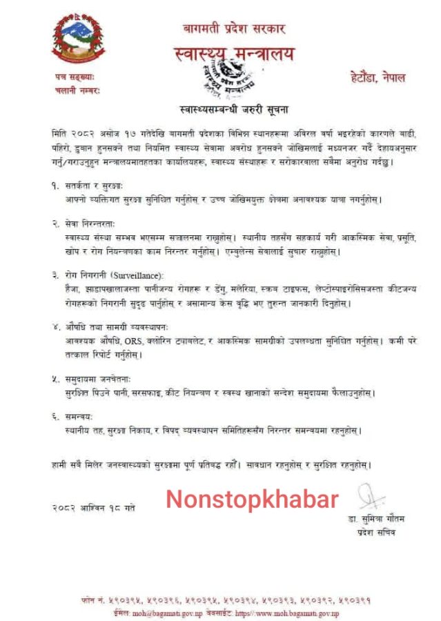 यसै क्रममा बागमती प्रदेश स्वास्थ्य मन्त्रालयले विपद् पूर्वतयारीमा जुट्न सम्पूर्ण स्वास्थ्य संस्था, अस्पताल र स्वास्थ्यकर्मीलाई विशेष आग्रह गरेको छ । मन्त्रालयले जारी गरेको सूचनामा अबिरल वर्षासँगै बाढी, पहिरो तथा अन्य प्राकृतिक विपद् आउने उच्च जोखिम रहेको भन्दै स्वास्थ्य सेवामा कुनै कमी नहोस् भनेर सतर्क रहन निर्देशन दिएको हो ।