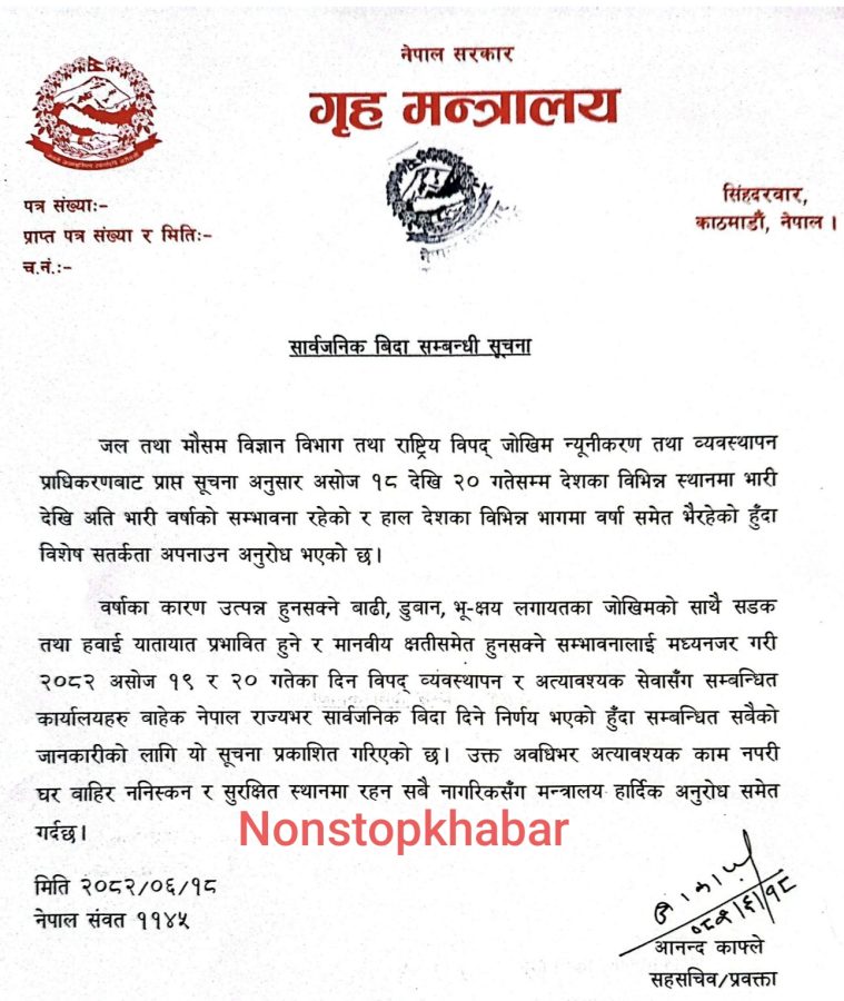 गृह मन्त्रालयले एक सूचना जारी गर्दै जल तथा मौसम बिज्ञान बिभाग र विपद ब्यवस्थापन प्राधिकरणले सोमबारसम्म भारी वर्षाको प्रक्षेपण गरेकाले सम्भावित विपद बाट बच्न विपद ब्यवस्थापनमा जुट्ने जनशक्ति र कार्यालय बाहेकमा लागू हुनेगरी सार्वजनिक बिदा दिएको स्पष्ट पारेको छ ।