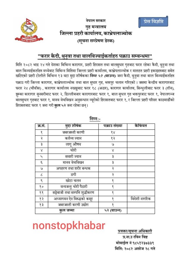 काभ्रेपलान्चोक । जिल्ला प्रहरी कार्यालय काभ्रेपलान्चोकले ५२ जना फरार अपराधीलाई पक्राउ गर्न सफल भएको छ । गत भदौ २४ गते कारागारबाट निस्किएर नफर्किएका ५२ जनालाई पक्राउ गरिएको हो ।