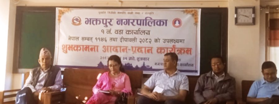 भक्तपुर । भक्तपुर नगरपालिका वडा नं १ को आयोजनामा शुक्रबार नेपाल सम्वत् ११४६ र दिपावलीको अवसरमा सामुदायिक विद्यालयका शिक्षकबीच शुभकामना आदानप्रदान कार्यक्रम सम्पन्न भयो।