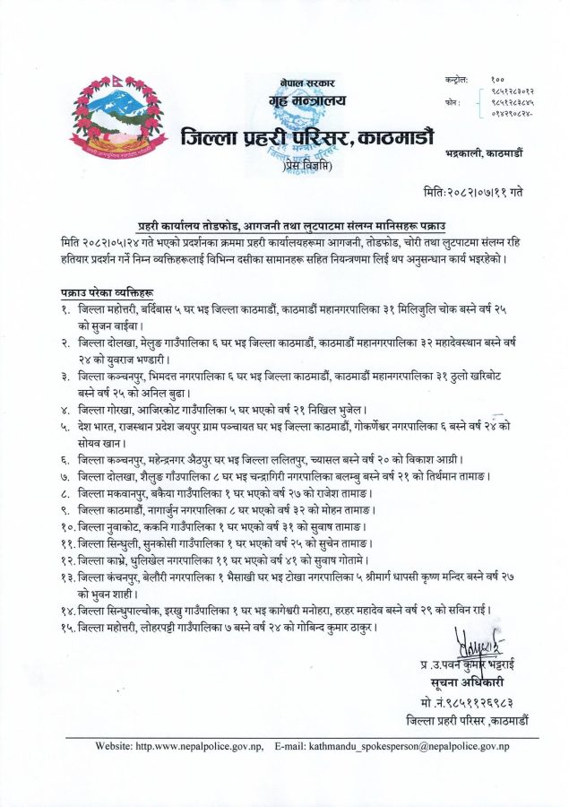 काठमाडौँ । गत भदौ २४ गते भएको प्रदर्शनका क्रममा तोडफोड, आगजनी, चोरी तथा लुटपाटमा संलग्न रही हतियार प्रदर्शन गर्ने १५ जनालाई प्रहरीले पक्राउ गरेको छ।