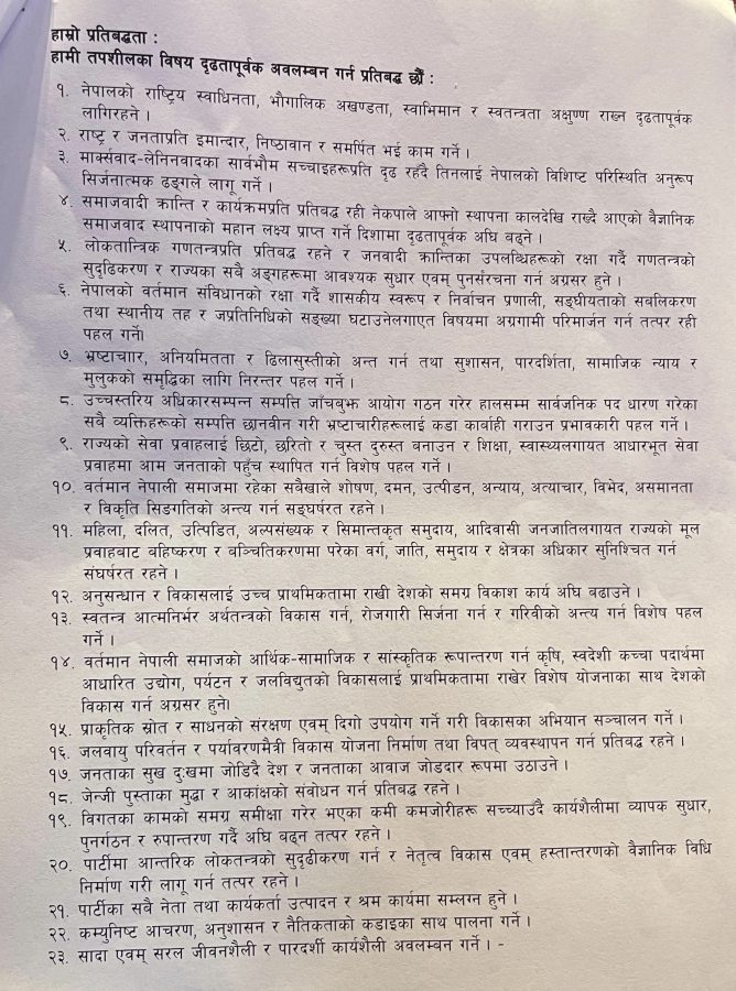 हेर्नुस् बलियो बामपन्थी शक्तिको रुपमा एकताबद्ध भएको नेपाली कम्युनिस्ट पार्टीले आज पारित गरेको २३ बुँदे प्रतिवद्धता ।