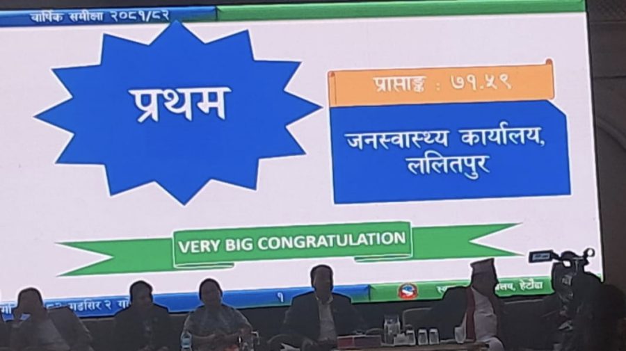 जनस्वास्थ्य कार्यालयले प्रदान गर्ने सेवासुविधा, कार्यसम्पादनलगायत विभिन्न शीर्षकअन्तर्गत भएको मूल्याङ्कनमा कुल १०० अङ्कमध्ये ७१.५९ अङ्क प्राप्त गर्दै ललितपुर जिल्ला उत्कृष्ट घोषित भएको हो ।