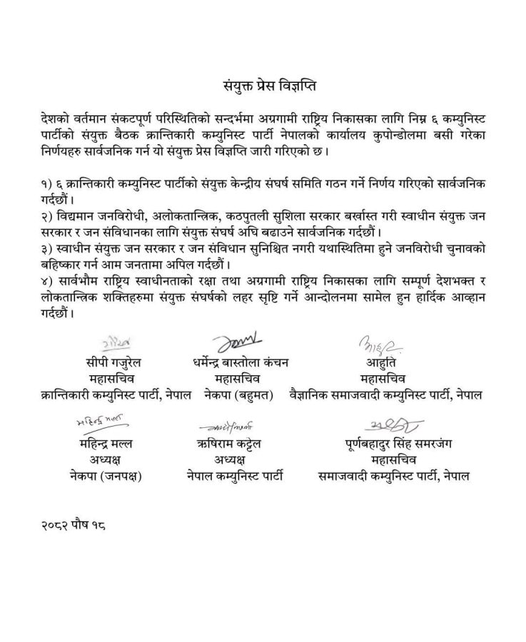 विज्ञप्तिमा क्रान्तिकारी कम्युनिस्ट पार्टी नेपालका महासचिव सीपी गजुरेल, नेकपा (बहुमत)का महासचिव धर्मेन्द्र बास्तोला ‘कञ्चन’, वैज्ञानिक समाजवादी कम्युनिस्ट पार्टी नेपालकी महासचिव बिश्वभक्त दुलाल आहूति, नेकपा (जनपक्ष)का अध्यक्ष महेन्द्र मल्ल, नेपाल कम्युनिस्ट पार्टीका अध्यक्ष ऋषिराम कट्टेल तथा समाजवादी कम्युनिस्ट पार्टी नेपालका महासचिव पूर्णबहादुर सिंह समरजंगको हस्ताक्षर रहेको छ।