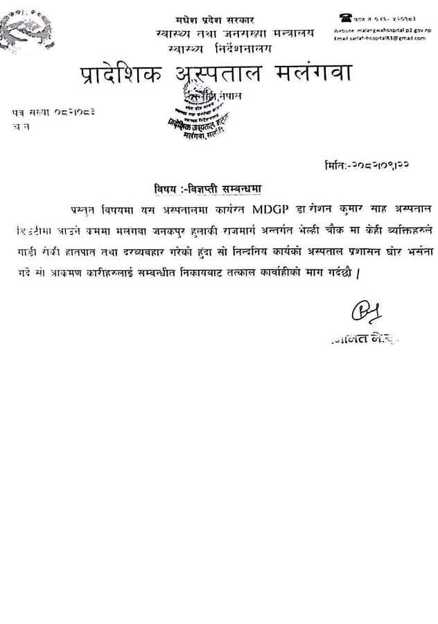 मलङ्गवा अस्पतालका डा साहमाथि दुर्ब्यवहार