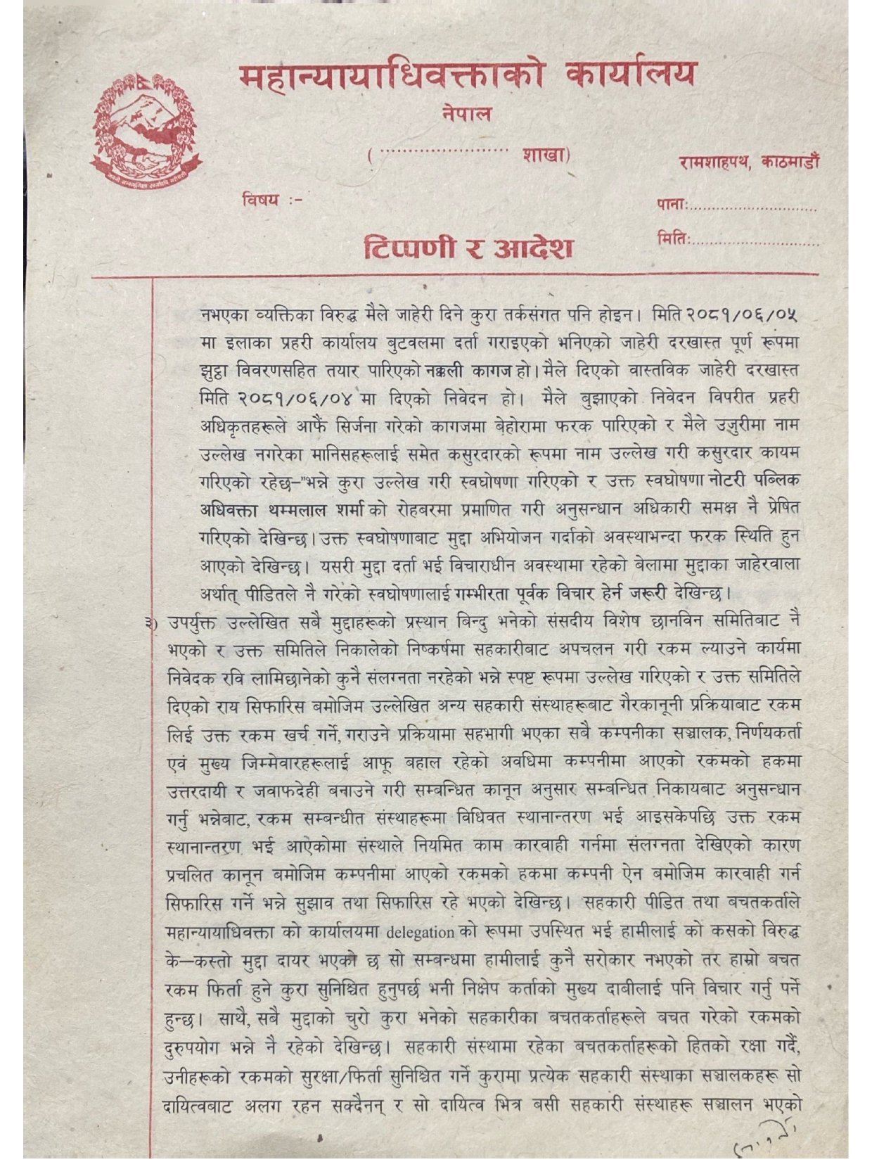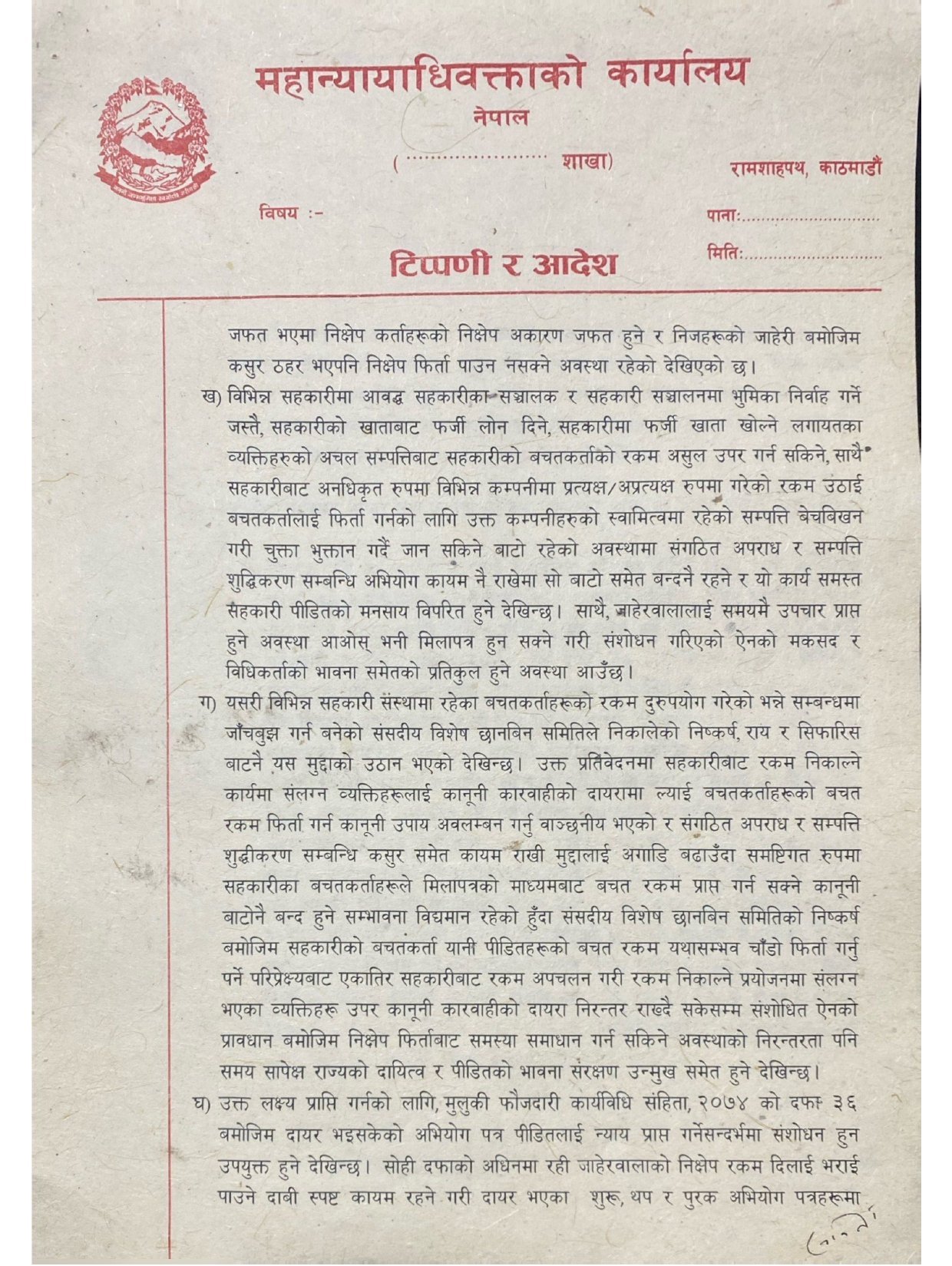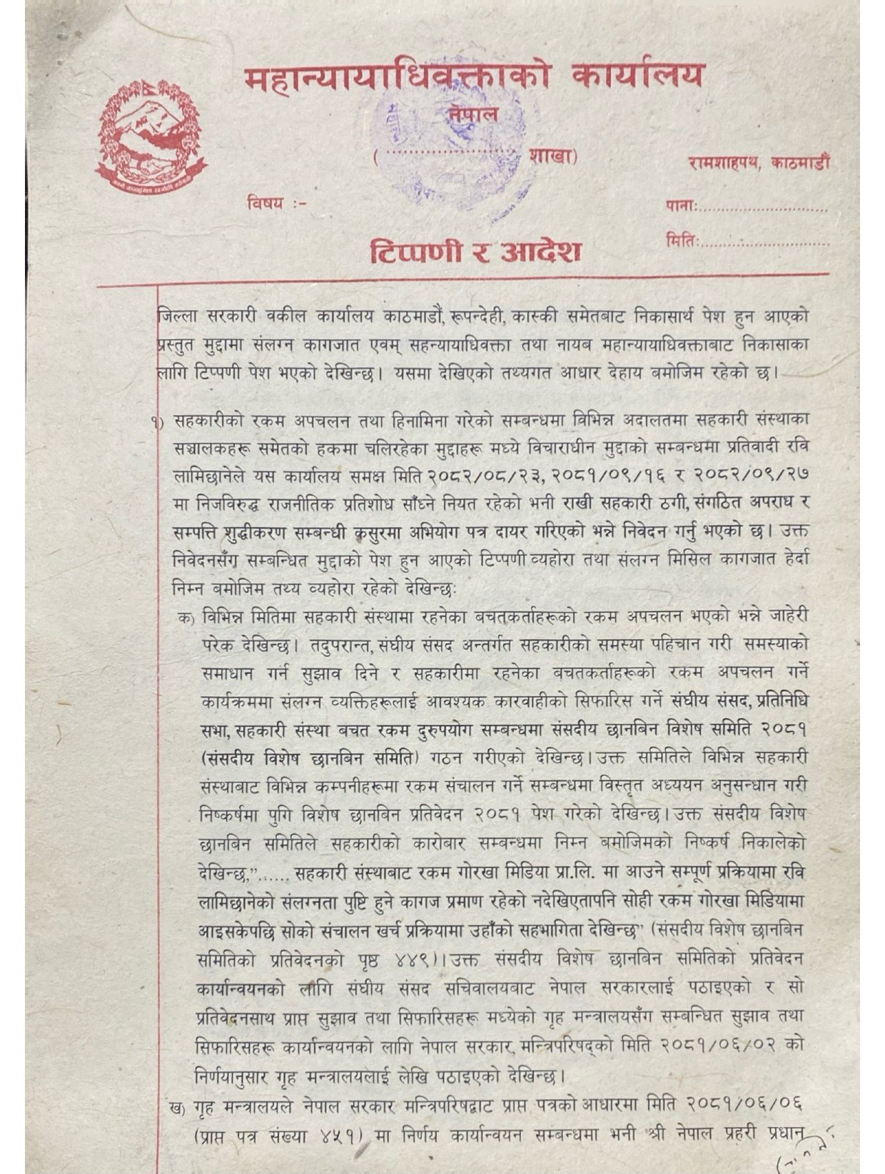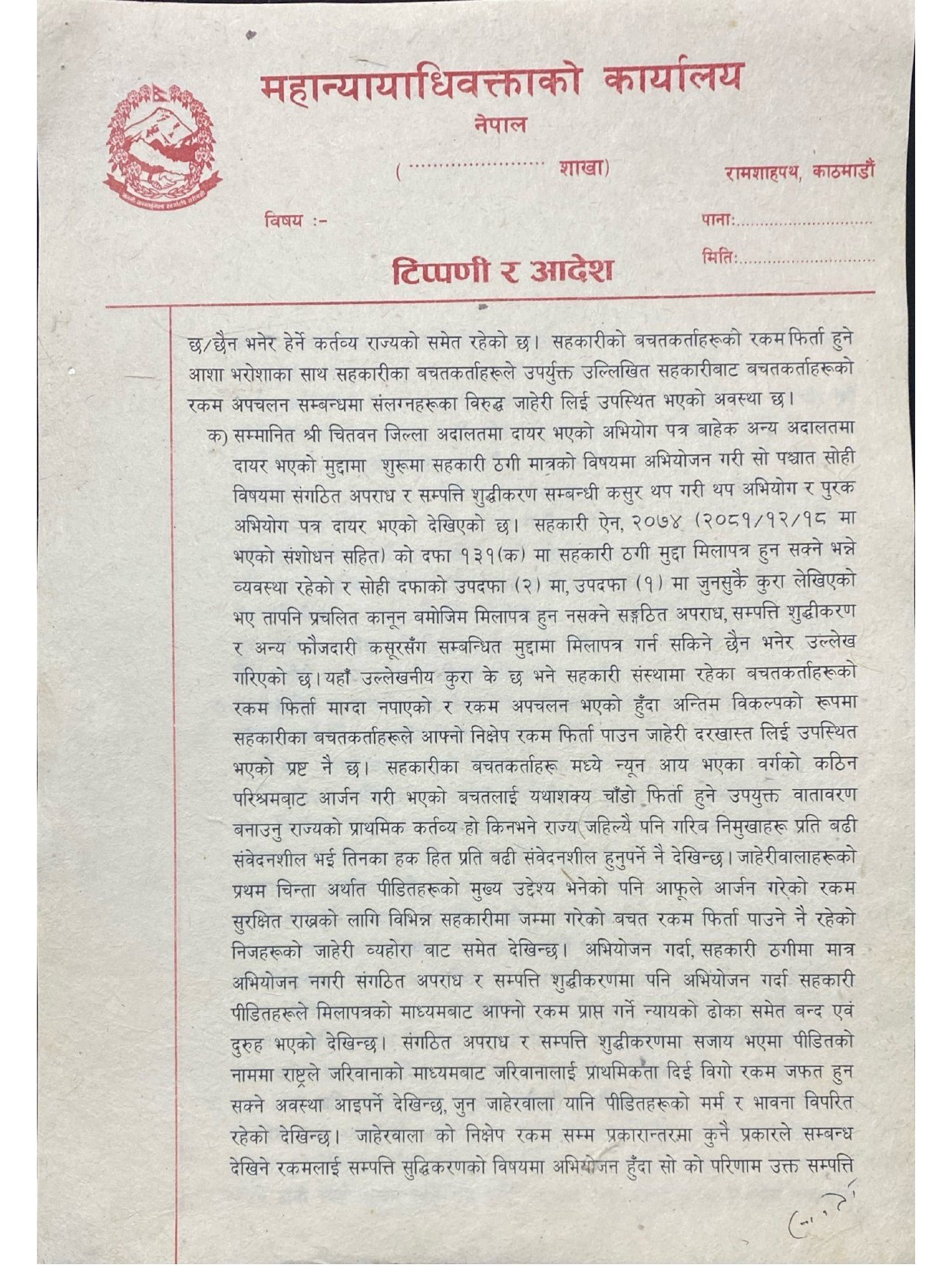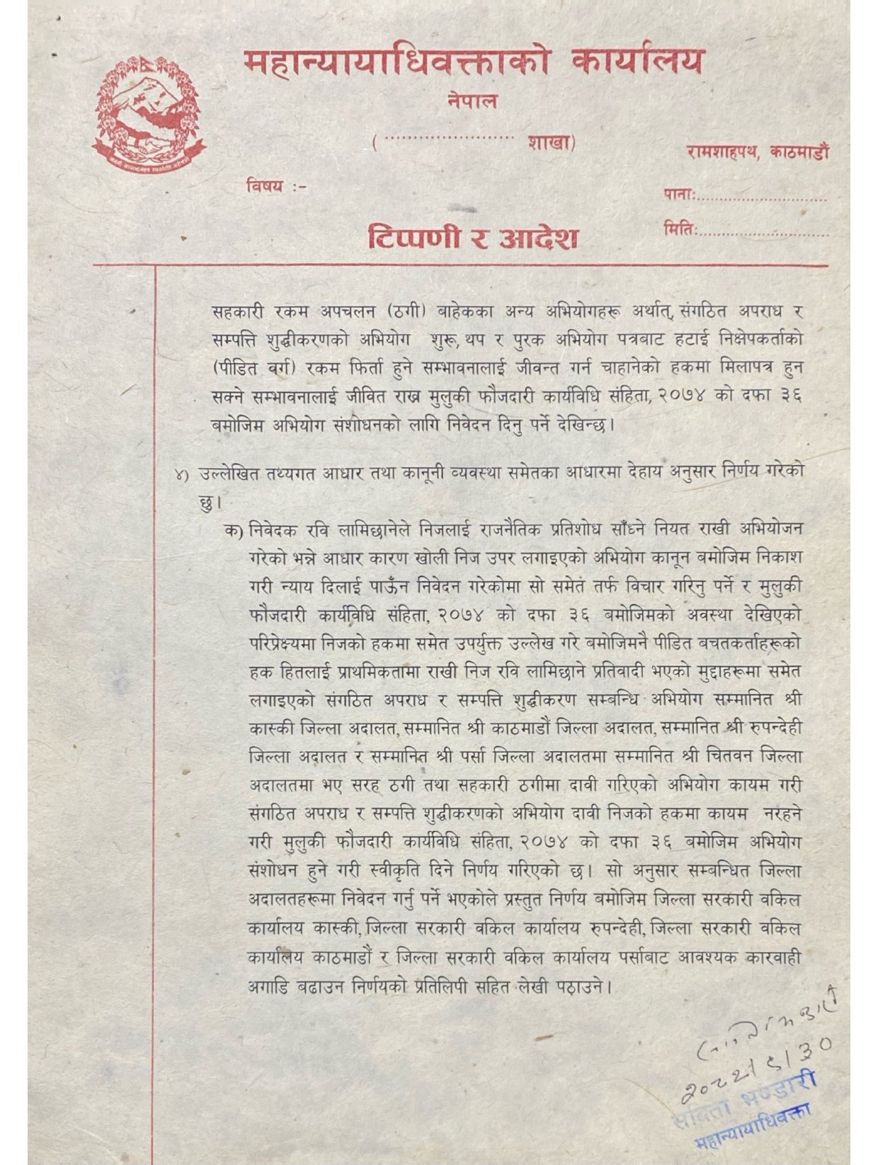 कार्यालयको आदेशमा भनिएको छ,‘ निवेदक रवि लामिछानेले निजलाई राजनैतिक प्रतिशोध साँध्ने नियत राखी अभियोजन गरेको भन्ने आधार कारण खोली निज उपर लगाइएको अभियोग कानुन बमोजिम निकास गरी न्याय दिलाई पाऊँ निवेदन गरेकोमा सो समेत तर्फ विचार गरिनु पर्ने र मुलुकी फौजदारी कार्यविधि संहिता, २०७४ को दफा ३६ बमोजिमको अवस्था देखिएको परिप्रेक्ष्यमा निजको हकमा समेत उपर्युक्त उल्लेख गरे बमोजिम नै पीडित बचतकर्ताहरूको हक हितलाई प्राथमिकतामा राखी निज रवि लामिछाने प्रतिवादी भएको मुद्दाहरूमा समेत लगाइएको सङ्गठित अपराध र सम्पत्ति शुद्धीकरण सम्बन्धी अभियोग सम्मानित श्री कास्की जिल्ला अदालत, सम्मानित श्री काठमाडौँ जिल्ला अदालत, सम्मानित श्री रुपन्देही जिल्ला अदालत र सम्मानित श्री पर्सा जिल्ला अदालतमा सम्मानित श्री चितवन जिल्ला अदालतमा भए सरह ठगी तथा सहकारी ठगीमा दाबी गरिएको अभियोग कायम गरी सङ्गठित अपराध र सम्पत्ति शुद्धीकरणको अभियोग दाबी निजको हकमा कायम नरहने गरी मुलुकी फौजदारी कार्यविधि संहिता, २०७४ को दफा ३६ बमोजिम अभियोग संशोधन हुने गरी स्वीकृति दिने निर्णय गरिएको छ। सो अनुसार सम्बन्धित जिल्ला अदालतहरूमा निवेदन गर्नु पर्ने भएकोले प्रस्तुत निर्णय बमोजिम जिल्ला सरकारी वकिल कार्यालय कास्की, जिल्ला सरकारी वकिल कार्यालय रुपन्देही, जिल्ला सरकारी वकिल कार्यालय काठमाडौँ र जिल्ला सरकारी वकिल कार्यालय पर्साबाट आवश्यक कारबाही अगाडि बढाउन निर्णयको प्रतिलिपि सहित लेखी पठाउने ।’