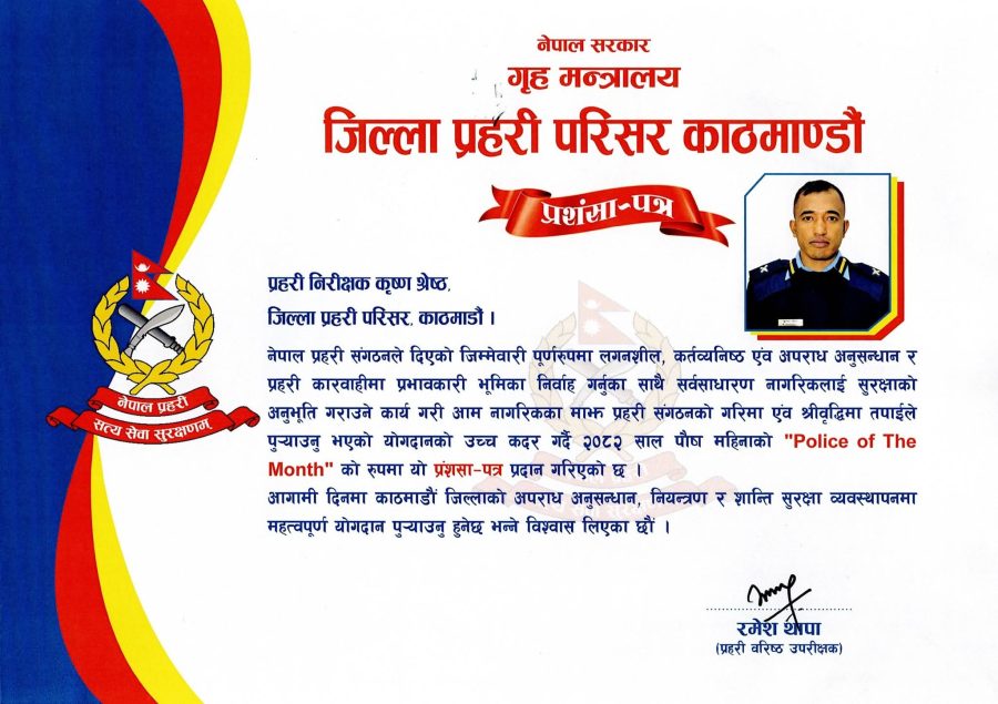 काठमाडौं । सर्वसाधारण नागरिकलाई सुरक्षाको अनुभूति दिलाउने उद्देश्यसहित गरिएको प्रभावकारी प्रहरी अनुसन्धानमार्फत उल्लेखनीय योगदान पुर्याएको भन्दै जिल्ला प्रहरी परिसर काठमाडौंका प्रहरी निरीक्षक कृष्ण श्रेष्ठलाई २०८२ साल पौष महिनाको उत्कृष्ट प्रहरी “Police of The Month” घोषित गरिएको छ।