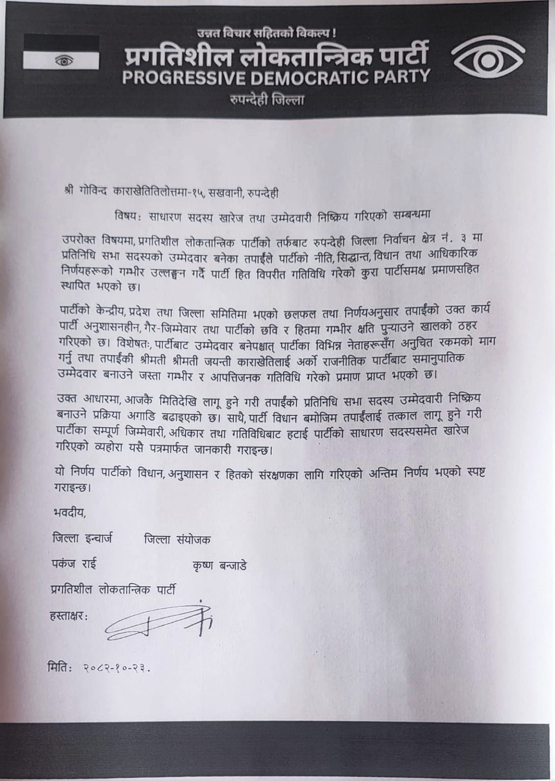 बुटवल । प्रगतिशिल लोकतान्त्रिक पार्टी (प्रलोपा) बाट रुपन्देही–३ मा प्रतिनिधिसभा सदस्य उम्मेदवार गोविन्द काराखेती पार्टीबाट निष्कासित भएका छन् ।
