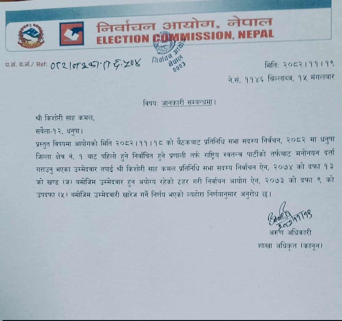 निर्वाचन आयोगका कार्यवाहक प्रमुख रामप्रसाद भण्डारीका अनुसार धनुषा क्षेत्र नम्बर १ का उम्मेदवार साहको उम्मेदवारी खारेज गरिएको हो। बैंक तथा वित्तीय संस्थाको कालोसूचीमा रहेको प्रमाण पुगेपछि उम्मेदवारी खारेज गरिएको हो ।