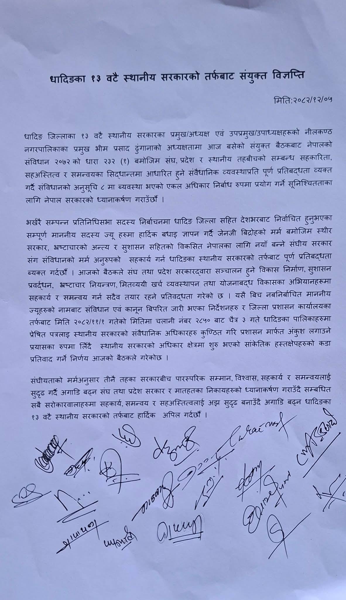 धादिङका १३ वटै स्थानीय तहले संयुक्त विज्ञप्ति जारी गर्दै संघीयता कार्यान्वयन र स्थानीय तहको अधिकार सुनिश्चित गर्न पनि जोड दिएका छन्।