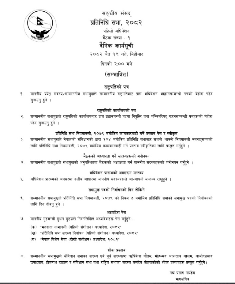 संघीय संसद् सचिवालयले प्रतिनिधिसभाको पहिलो अधिवेशनअन्तर्गत पहिलो बैठकका लागि सम्भावित कार्यसूची सार्वजनिक गरेको छ ।