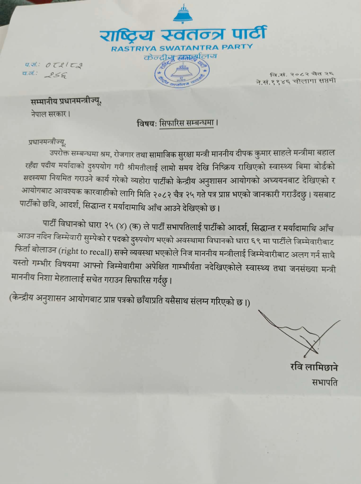‘पार्टीको विधानको धारा २५(४) (क)ले पार्टी सभापतिलाई पार्टीको आदर्श, सिद्धान्त र मर्यादामाथि आँच आउन नदिन जिम्मेवारी सम्पेको र पदको दुरुपयोग भएको अवस्थामा विधानको धारा ६९ मा पार्टीले जिम्मेवारीबाट फिर्ता बोलाउन सक्ने व्यवस्था भएकोले निज माननीय मन्त्रीलाई जिम्मेवारी अलग गर्नका साथै यस्तो गम्भीर विषयमा आफ्नो जिम्मेवारीमा अपेक्षित गाम्भीर्यता नदेखिएकाले स्वास्थ्य तथा जनसंख्या मन्त्री निशा मेहतालाई सचेत गराउन सिफारिस गर्दछु’ लामिछानले बालेनलाई लेखेको सिफारिस पत्रमा उल्लेख छ ।