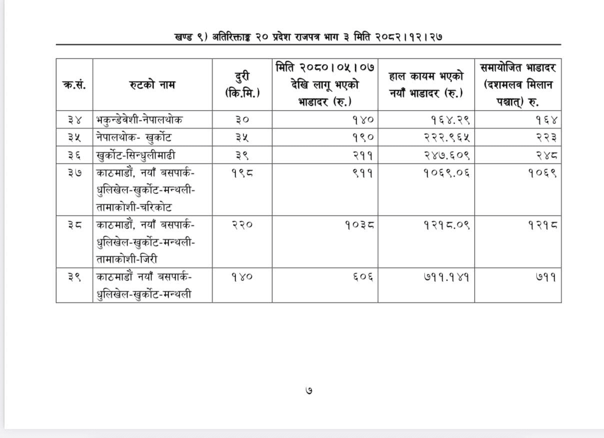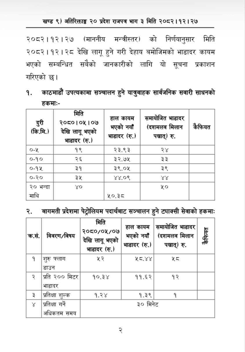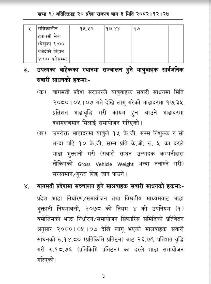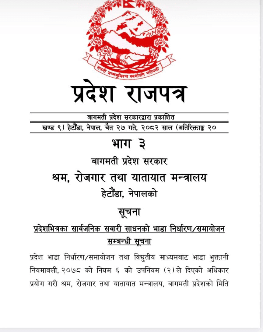 शुक्रबार बागमती प्रदेश श्रम रोजगार तथा यातायात मन्त्रालयले यातायात व्यवसायीको सहमतिमा प्रदेशभित्रका सहर–बस्तीमा सञ्चालन हुने सार्वजनिक यातायातको लागि समायोजन गरेको जनाएको छ। साथै भाडादर समायोजन गरी राजपत्रमा प्रकाशित गरेको छ ।