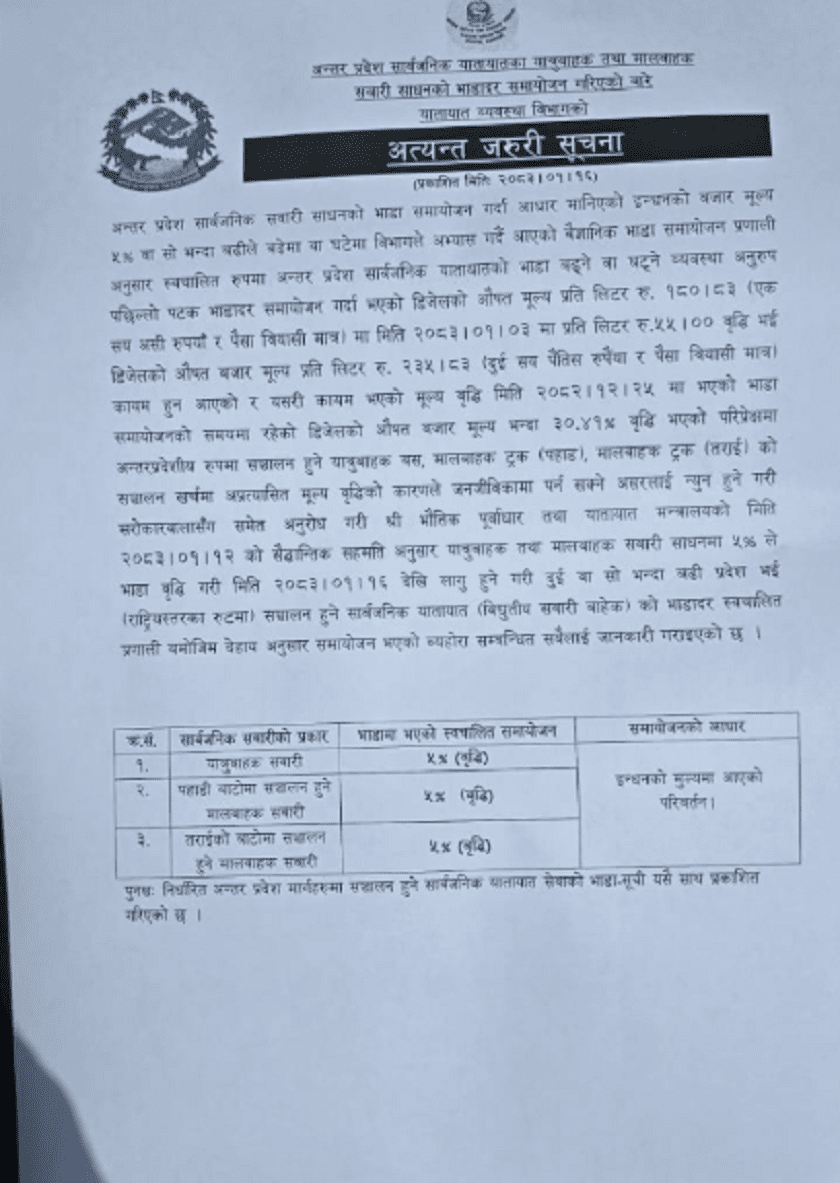 त्यसयता २ पटक इन्धनको मूल्य वृद्धि भइ डिजेलमा ५५ रुपैयाँ बढी पुगेपछि यातायात व्यवसायीहरू भाडा पुन समायोजन गर्न माग गर्दै आएका थिए ।